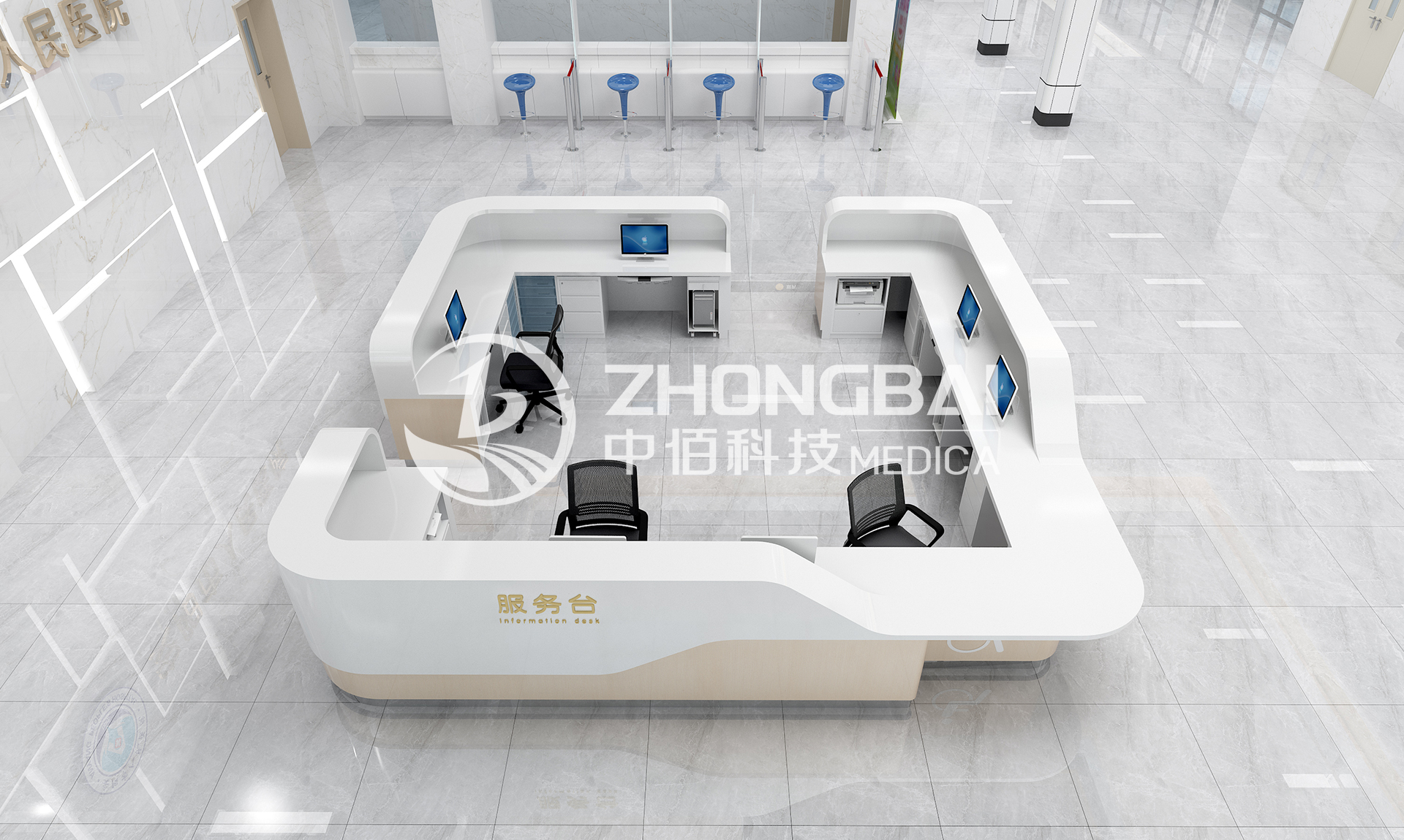 親切優(yōu)雅是設計服務臺的宗旨,力求其與環(huán)境相融合,讓醫(yī)務工作者及周邊的人群感到踏實溫暖;設計新穎大方、布局合理使用。